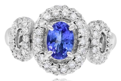18KT WHITE GOLD FRIENDSHIP LOVE RING. 3D CLASSIC HALO DESIGN. ROUND DIAMONDS ARE F/G COLOR, VSSI CLARITY .64 CARATS. AAA EXTRA FACETED OVAL TANZANITE IS .70 CARATS. RING SIZE 7. CAN BE SIZED BY OUR MASTER JEWELER UPON REQUEST. WRITTEN APPRAISAL AVAILABLE. COMES IN A PRESENTABLE GIFT BOX.