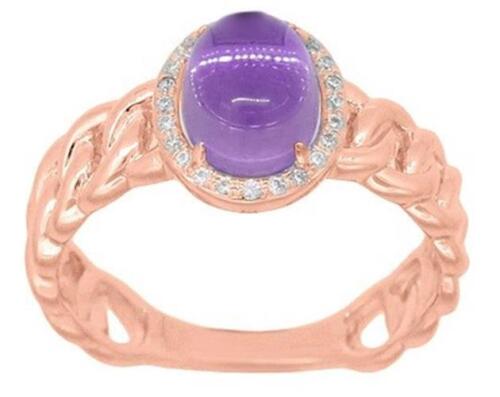 14KT ROSE GOLD FUN RING. 3D LOVE KNOT DESIGN. ROUND DIAMONDS ARE F/G COLOR, VSSI CLARITY .07 CARATS. AAA OVAL AMETHYST IS 1.28 CARATS. RING SIZE 7. CAN BE SIZED BY OUR MASTER JEWELER UPON REQUEST. WRITTEN APPRAISAL AVAILABLE. COMES IN A PRESENTABLE GIFT BOX.