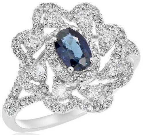 14KT WHITE GOLD FUN RING. 3D FLOWER DESIGN. ROUND DIAMONDS ARE F/G COLOR, VSSI CLARITY .69 CARATS. AAA OVAL SAPPHIRE IS .66 CARATS. RING SIZE 7. CAN BE SIZED BY OUR MASTER JEWELER UPON REQUEST. WRITTEN APPRAISAL AVAILABLE. COMES IN A PRESENTABLE GIFT BOX.