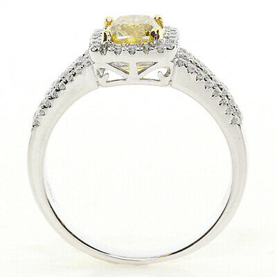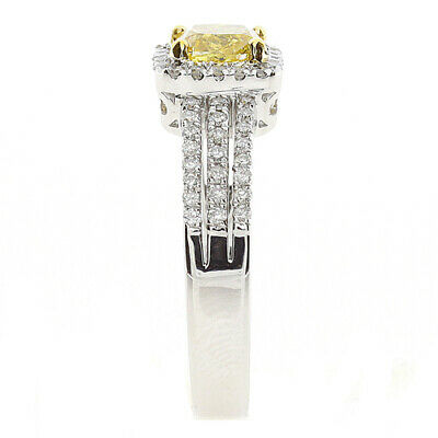 18KT WHITE AND YELLOW GOLD ENGAGEMENT RING. 3D CLASSIC SQUARE HALO DESIGN. ROUND WHITE DIAMONDS ARE F/G COLOR, VSSI CLARITY .35 CARATS. CUSHION CUT FANCY YELLOW DIAMOND IS 1.0 CARAT. RING SIZE 7. CAN BE SIZED BY OUR MASTER JEWELER UPON REQUEST. WRITTEN APPRAISAL AVAILABLE. COMES IN A PRESENTABLE GIFT BOX.