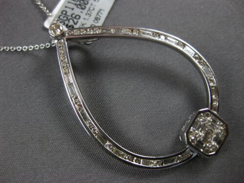 14KT WHITE GOLD FLOATING PENDANT. 3D INVISIBLE OCTAGON OPEN TEAR DROP DESIGN. ROUND AND BAGUETTE DIAMONDS ARE F/G COLOR, VSSI CLARITY 1.37 CARATS. MEASURES 41.5mm X 26.5mm. CHAIN NOT INCLUDED WITH PENDANT. WRITTEN APPRAISAL AVAILABLE. COMES IN A PRESENTABLE GIFT BOX.
