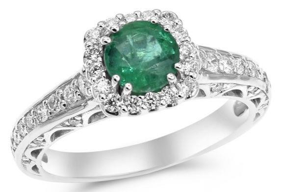 18KT WHITE GOLD ENGAGEMENT RING. 3D HALO FILIGREE DESIGN. DIAMONDS ARE F/G COLOR, VSSI CLARITY .56 CARATS. AAA ROUND EMERALD IS .81 CARATS. RING SIZE 7. CAN BE SIZED BY OUR MASTER JEWELER UPON REQUEST. WRITTEN APPRAISAL AVAILABLE. COMES IN A PRESENTABLE GIFT BOX.