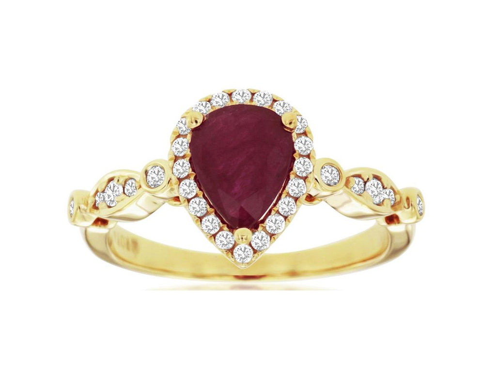 14KT YELLOW GOLD ENGAGEMENT RING. 3D CLASSIC HALO DESIGN. ROUND DIAMONDS ARE F/G COLOR, VSSI CLARITY .25 CARATS. AAA PEAR SHAPE RUBY IS 1.12 CARATS. RING SIZE 7. CAN BE SIZED BY OUR MASTER JEWELER UPON REQUEST. WRITTEN APPRAISAL AVAILABLE. COMES IN A PRESENTABLE GIFT BOX.