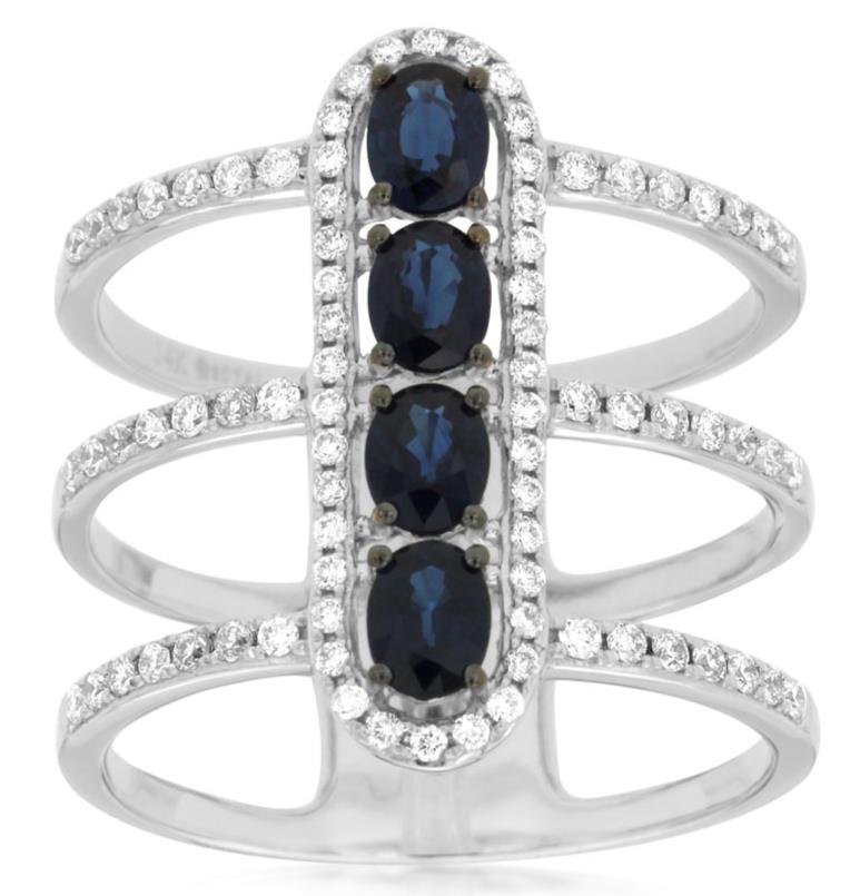 14KT WHITEGOLD FUN RING. 3D TRIPLE DESIGN. ROUND DIAMONDS ARE F/G COLOR, VSSI CLARITY 0.42 CARATS. AAA OVAL SAPPHIRES ARE 0.95 CARATS.CAN BE SIZED BY OUR MASTER JEWELER UPON REQUEST. WRITTEN APPRAISAL AVAILABLE. COMES IN A PRESENTABLE GIFT BOX.