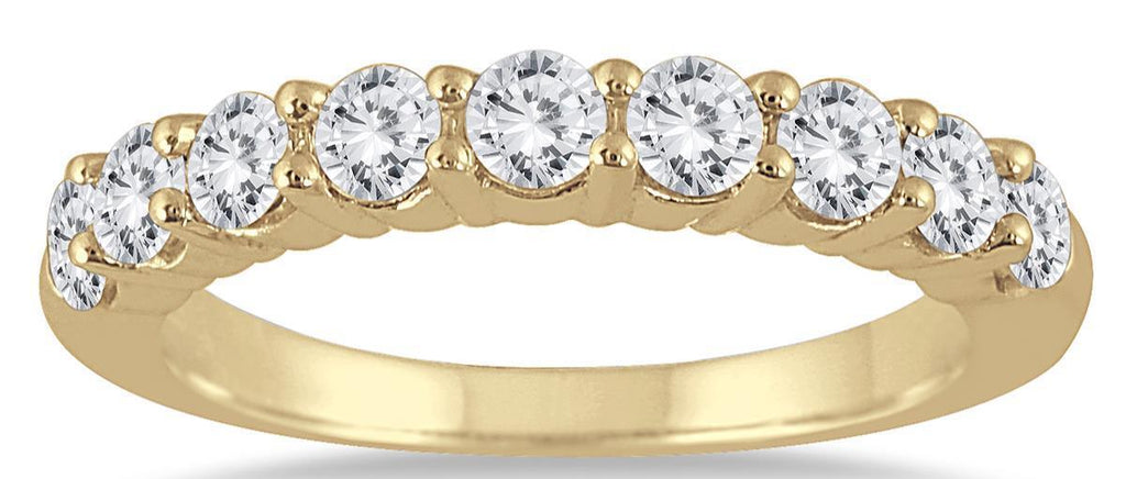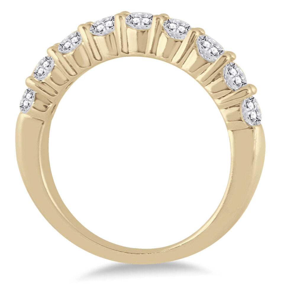 14KT YELLOW GOLD WEDDING ANNIVERSARY RING. 3D CLASSIC NINE STONE SHARED PRONG DESIGN. ROUND DIAMONDS ARE G/H COLOR, SI CLARITY 1.38 CARATS. RING SIZE 6.5. CAN BE SIZED BY OUR MASTER JEWELER UPON REQUEST. WRITTEN APPRAISAL AVAILABLE. COMES IN A PRESENTABLE GIFT BOX.