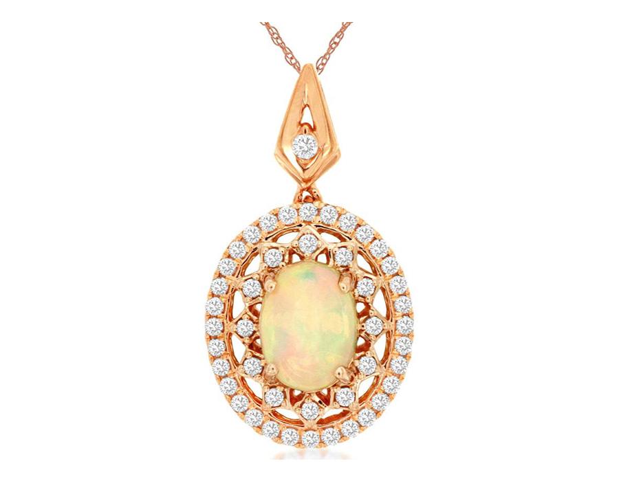 14KT ROSE GOLD FLOATING PENDANT. 3D FILIGREE FLOWER DESIGN. ROUND DIAMONDS ARE F/G COLOR, VSSI CLARITY .48 CARATS. AAA OVAL OPAL IS .90 CARATS. COMES ON A 14KT GOLD DIAMOND CUT 18" INCH CHAIN. WRITTEN APPRAISAL AVAILABLE. COMES IN A PRESENTABLE GIFT BOX.