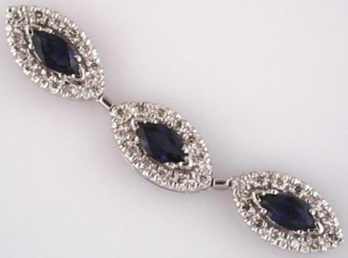 14KT WHITE GOLD FLOATING PENDANT. 3D PAST PRESENT FUTURE DESIGN. ROUND DIAMONDS ARE F/G COLOR, VSSI CLARITY .38 CARATS. AAA MARQUISE SHAPE SAPPHIRES ARE 1.0 CARATS. COMES ON A 14KT GOLD DIAMOND CUT 16" INCH CHAIN. WRITTEN APPRAISAL AVAILABLE. COMES IN A PRESENTABLE GIFT BOX.