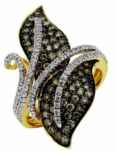 1.38CT WHITE & CHOCOLATE FANCY DIAMOND 14KT YELLOW GOLD 3D DOUBLE LEAF FUN RING