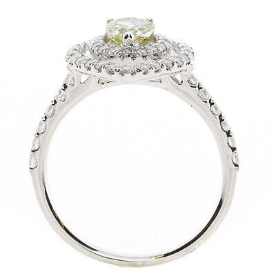 18KT WHITE AND YELLOW GOLD ENGAGEMENT RING. 3D CLASSIC DOUBLE HALO DESIGN. ROUND WHITE DIAMONDS ARE F/G COLOR, VSSI CLARITY .73 CARATS. PEAR SHAPE FANCY YELLOW DIAMOND IS .65 CARATS. RING SIZE 7. CAN BE SIZED BY OUR MASTER JEWELER UPON REQUEST. WRITTEN APPRAISAL AVAILABLE. COMES IN A PRESENTABLE GIFT BOX.