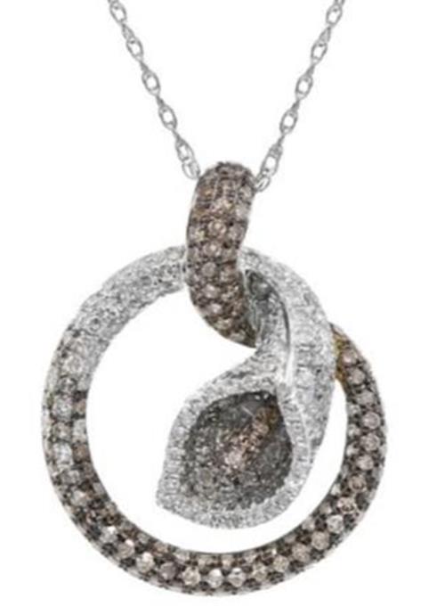 14KT WHITE GOLD PENDANT. 3D LOVE KNOT CIRCULAR SNAKEDESIGN. DIAMONDS ARE F/G COLOR, VSSI CLARITY .70CARATS.MOCHA DIAMONDS ARE .68 CARATS.COMES ON A 14KT GOLD DIAMOND CUT 16" INCH CHAIN.WRITTEN APPRAISAL AVAILABLE. COMES IN A PRESENTABLE GIFT BOX.