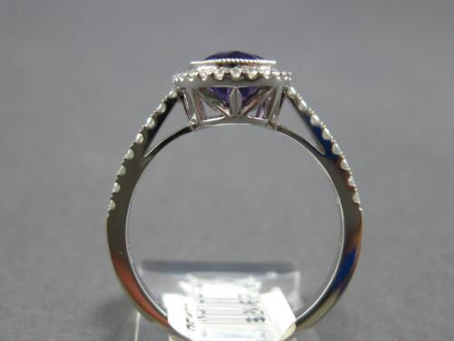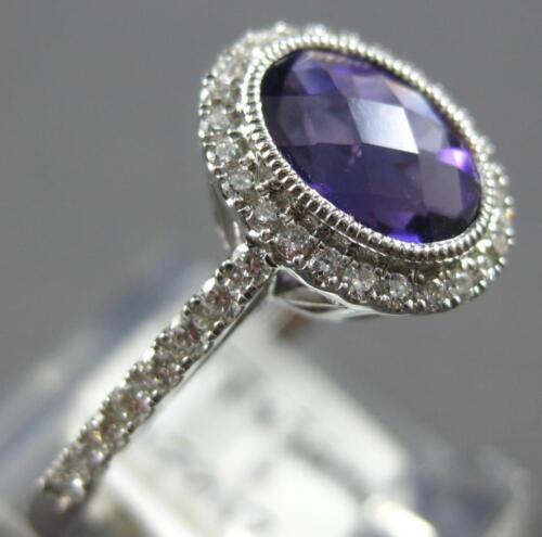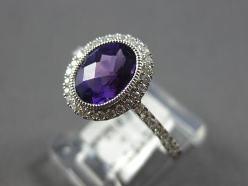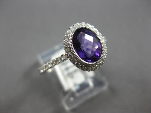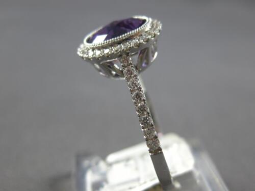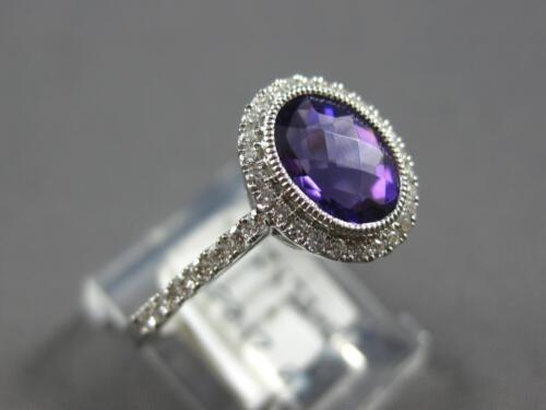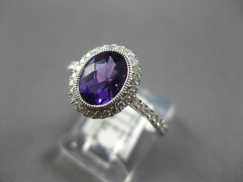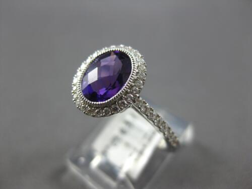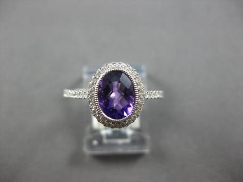 14KT WHITE GOLD FRIENDSHIP LOVE RING. 3D FILIGREE HALO DESIGN. ROUND DIAMONDS ARE F/G COLOR, VSSI CLARITY .29 CARATS. AAA EXTRA FACETED OVAL AMETHYST IS 1.10 CARATS. MEASURES 10mm WIDE. RING SIZE 7. CAN BE SIZED BY OUR MASTER JEWELER UPON REQUEST. WRITTEN APPRAISAL AVAILABLE. COMES IN A PRESENTABLE GIFT BOX.