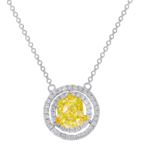 1.39CT WHITE & FANCY YELLOW DIAMOND 18K WHITE GOLD DOUBLE HALO FUN LOVE NECKLACE