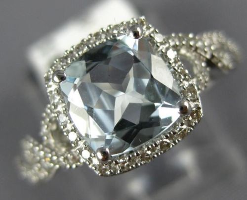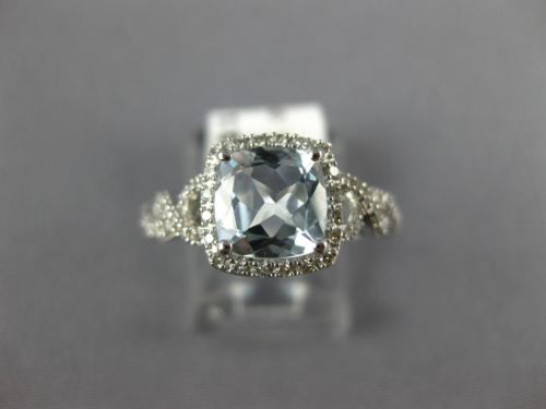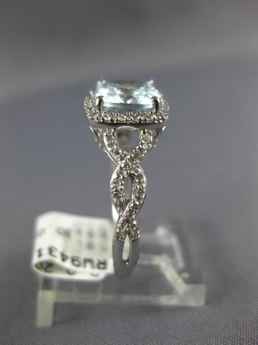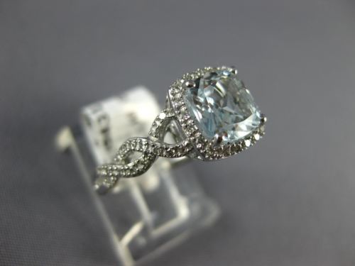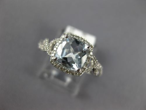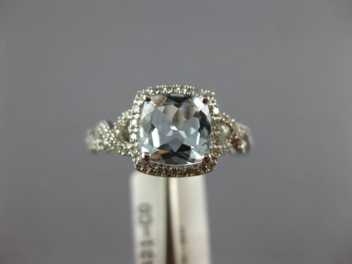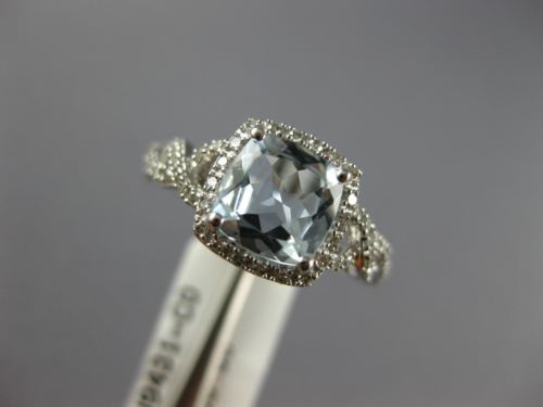 ESTATE 14KT WHITE GOLD ENGAGEMENT RING. 3D HALO SQUARE INFINITY DESIGN. DIAMONDS ARE G/H COLOR, VSSI CLARITY .20 CARATS. AAA EXTRA FACET CUSHION CUT AQUAMARINE IS 1.20 CARATS. MEASURES 9mm WIDE. RING SIZE 7. CAN BE SIZED BY OUR MASTER JEWELER UPON REQUEST. WRITTEN APPRAISAL AVAILABLE. COMES IN A PRESENTABLE GIFT BOX.