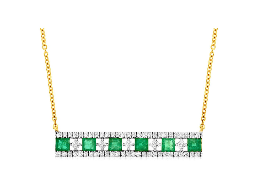 1.40CT DIAMOND & AAA EMERALD 14KT YELLOW GOLD ROUND & PRINCESS BAR LOVE NECKLACE