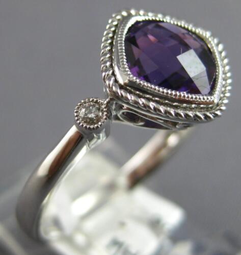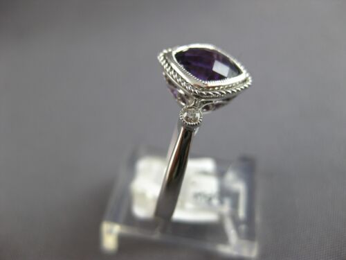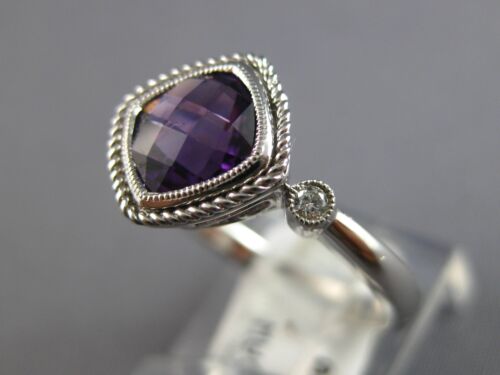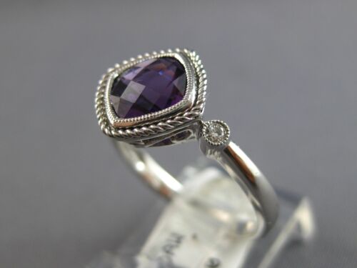 14KT WHITE GOLD FUN RING. 3D FILIGREE GEOMETRICAL DESIGN. ROUND DIAMONDS ARE F/G COLOR, VSSI CLARITY .04 CARATS. AAA EXTRA FACETED CUSHION CUT AMETHYST IS 1.38 CARATS. MEASURES 11mm WIDE. RING SIZE 7. CAN BE SIZED BY OUR MASTER JEWELER UPON REQUEST. WRITTEN APPRAISAL AVAILABLE. COMES IN A PRESENTABLE GIFT BOX.