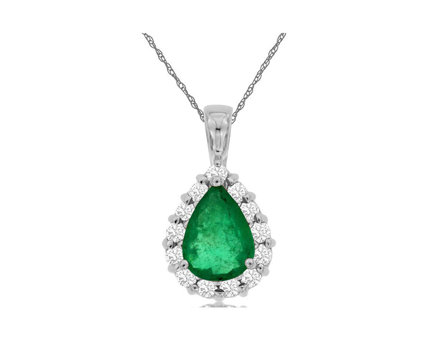 14KT WHITE GOLD FLOATING PENDANT. 3D CLASSIC HALO TEAR DROP DESIGN. ROUND DIAMONDS ARE F/G COLOR, VSSI CLARITY .30 CARATS. AAA PEAR SHAPE EMERALD IS 1.12 CARATS. COMES ON A 14KT GOLD DIAMOND CUT 18" INCH CHAIN. WRITTEN APPRAISAL AVAILABLE. COMES IN A PRESENTABLE GIFT BOX.