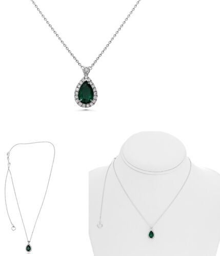 18KT WHITE GOLD LOVE NECKLACE. 3D CLASSIC TEAR DROP ADJUSTABLE DESIGN. ROUND DIAMONDS ARE F/G COLOR, VS CLARITY .26 CARATS. AAA PEAR SHAPE EMERALD IS 1.16 CARATS. 17" INCHES LONG.
