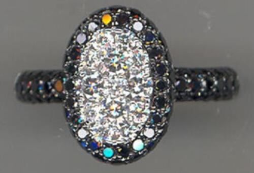 14KT WHITE GOLD LOVE RING. 3D CLASSIC CLUSTER OVAL DESIGN. WHITE DIAMONDS ARE F/G COLOR, VSSI CLARITY .55 CARATS. BLACK DIAMONDS ARE .87 CARATS. RING SIZE 7. CAN BE SIZED BY OUR MASTER JEWELER UPON REQUEST. WRITTEN APPRAISAL AVAILABLE. COMES IN A PRESENTABLE GIFT BOX.