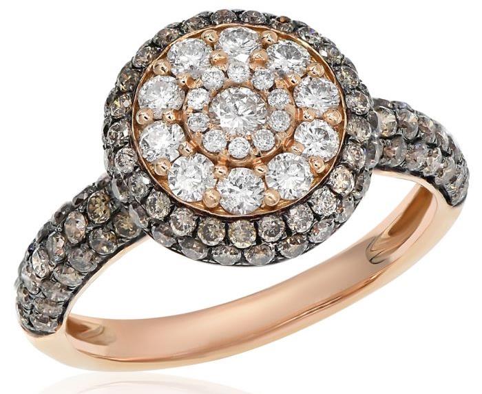 18KT WHITE GOLD FUN RING. 3D CLUSTER FLOWER HALO DESIGN. WHITE DIAMONDS ARE F/G COLOR, VSSI CLARITY .46 CARATS. CHOCOLATE FANCY DIAMONDS ARE .96 CARATS. RING SIZE 7. CAN BE SIZED BY OUR MASTER JEWELER UPON REQUEST. WRITTEN APPRAISAL AVAILABLE. COMES IN A PRESENTABLE GIFT BOX.