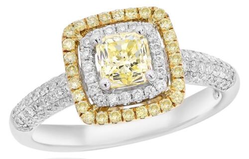 18KT WHITE AND YELLOW GOLD ENGAGEMENT RING. 3D SQUARE DOUBLE HALO DESIGN. WHITE DIAMONDS ARE F/G COLOR, VSSI CLARITY .55 CARATS. FANCY YELLOW DIAMONDS ARE .87 CARATS. RING SIZE 7. CAN BE SIZED BY OUR MASTER JEWELER UPON REQUEST. WRITTEN APPRAISAL AVAILABLE. COMES IN A PRESENTABLE GIFT BOX.
