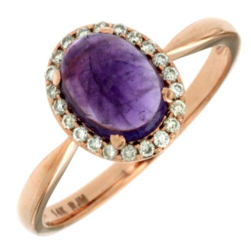 14KT ROSE GOLD LOVE RING. 3D CLASSIC HALO DESIGN. ROUND DIAMONDS ARE F/G COLOR, VSSI CLARITY .14 CARATS. AAA OVAL CABOCHON AMETHYST IS 1.30 CARATS. RING SIZE 7. CAN BE SIZED BY OUR MASTER JEWELER UPON REQUEST. WRITTEN APPRAISAL AVAILABLE. COMES IN A PRESENTABLE GIFT BOX.