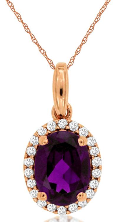 14KT ROSE GOLD FLOATING PENDANT. 3D HALO DESIGN. ROUND DIAMONDS ARE F/G COLOR, VSSI CLARITY .14 CARATS. AAA EXTRA FACETED OVAL AMETHYST IS 1.30 CARATS. COMES ON A 14KT GOLD DIAMOND CUT 18" INCH CHAIN. WRITTEN APPRAISAL AVAILABLE. COMES IN A PRESENTABLE GIFT BOX.