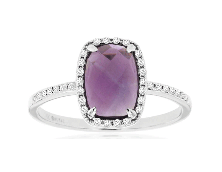 14KT WHITE GOLD FUN RING. 3D HALO DESIGN. ROUND DIAMONDS ARE F/G COLOR, VSSI CLARITY .14 CARATS. AAA EXTRA FACETED CUSHION CUT AMETHYST IS 1.30 CARATS. RING SIZE 7. CAN BE SIZED BY OUR MASTER JEWELER UPON REQUEST. WRITTEN APPRAISAL AVAILABLE. COMES IN A PRESENTABLE GIFT BOX.