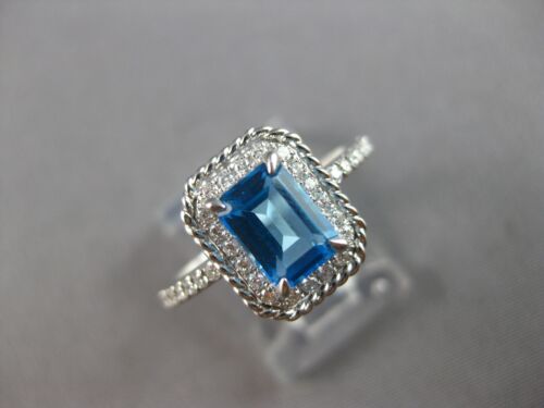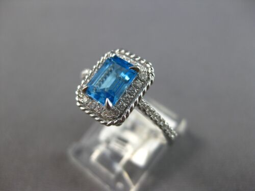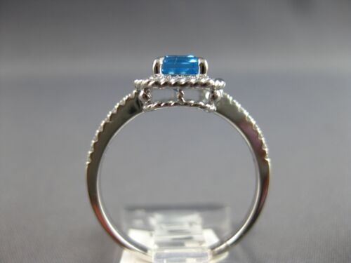 14KT WHITE GOLD RING. 3D FILIGREE HALO OCTAGON DESIGN. ROUND DIAMONDS ARE F/G COLOR, VSSI CLARITY .22 CARATS. AAA EMERALD CUT BLUE TOPAZ IS 1.22 CARATS. MEASURES 11.5mm WIDE. RING SIZE 7. CAN BE SIZED BY OUR MASTER JEWELER UPON REQUEST. WRITTEN APPRAISAL AVAILABLE. COMES IN A PRESENTABLE GIFT BOX.