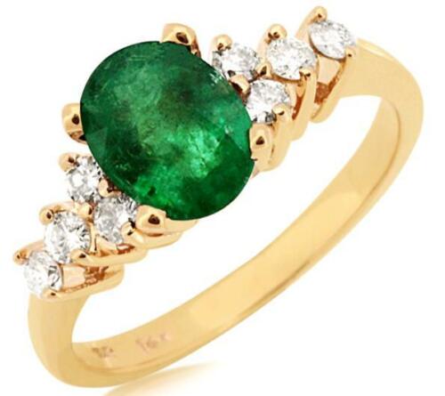 14KT YELLOW GOLD FRIENDSHIP LOVE RING. 3D CLASSIC DESIGN. ROUND DIAMONDS ARE F/G COLOR, VSSI CLARITY .35 CARATS. AAA OVAL EMERALD IS 1.10 CARATS. RING SIZE 7. CAN BE SIZED BY OUR MASTER JEWELER UPON REQUEST. WRITTEN APPRAISAL AVAILABLE. COMES IN A PRESENTABLE GIFT BOX.