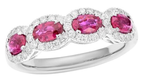 18KT WHITE GOLD ANNIVERSARY RING. 3D FLORAL DESIGN. ROUND DIAMONDS ARE F/G COLOR, VSSI CLARITY .39 CARATS. AAA OVAL RUBIES ARE 1.06 CARATS. RING SIZE 7. CAN BE SIZED BY OUR MASTER JEWELER UPON REQUEST. WRITTEN APPRAISAL AVAILABLE. COMES IN A PRESENTABLE GIFT BOX.