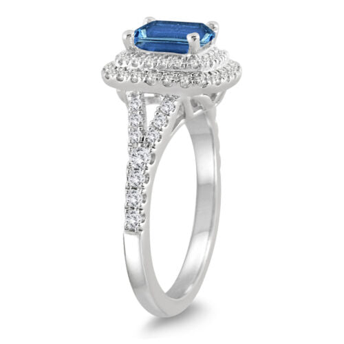 14KT WHITE GOLD ENGAGEMENT RING. 3D CLASSIC DOUBLE HALO DESIGN. ROUND DIAMONDS ARE G/H COLOR, SI CLARITY .49 CARATS. AAA EMERALD CUT SAPPHIRE IS .96 CARATS. RING SIZE 7. CAN BE SIZED BY OUR MASTER JEWELER UPON REQUEST. WRITTEN APPRAISAL AVAILABLE. COMES IN A PRESENTABLE GIFT BOX.