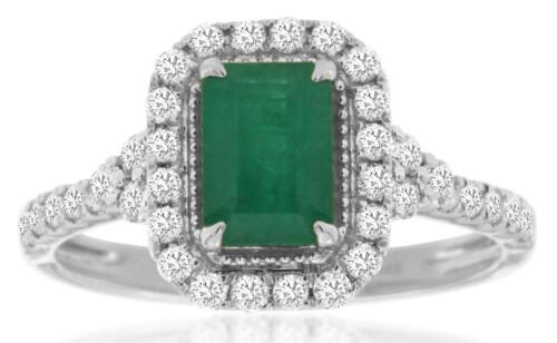 14KT WHITE GOLD ENGAGEMENT RING. 3D SQUARE HALO OCTAGON DESIGN. ROUND DIAMONDS ARE F/G COLOR, VSSI CLARITY .46 CARATS. AAA BAGUETTE EMERALD IS 1.0 CARAT. RING SIZE 7. CAN BE SIZED BY OUR MASTER JEWELER UPON REQUEST. WRITTEN APPRAISAL AVAILABLE. COMES IN A PRESENTABLE GIFT BOX.