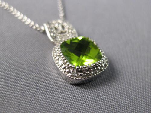 14KT WHITE GOLD FLOATING PENDANT. 3D SQUARE HALO DESIGN. ROUND DIAMONDS ARE F/G COLOR, VSSI CLARITY .06 CARATS. AAA EXTRA FACETED CUSHION CUT PERIDOT IS 1.40 CARATS. MEASURES 17.5mm X 10mm. COMES ON A 14KT GOLD DIAMOND CUT 16" INCH CHAIN. WRITTEN APPRAISAL AVAILABLE. COMES IN A PRESENTABLE GIFT BOX.