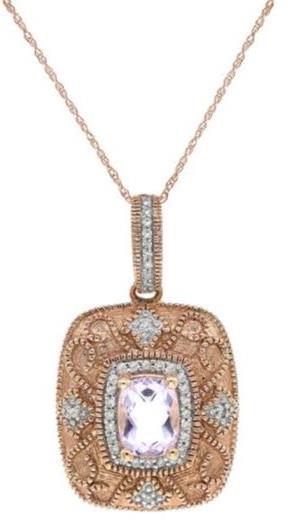 14KT ROSEGOLD PENDANT. 3D SQUAREDESIGN. ROUNDDIAMONDS ARE F/G COLOR, VSSI CLARITY .16 CARATS.AAA CUSHION CUT PINK AMETHYST IS 1.30CARATS.COMES ON A 14KT GOLD DIAMOND CUT 16" INCH CHAIN.WRITTEN APPRAISAL AVAILABLE. COMES IN A PRESENTABLE GIFT BOX.