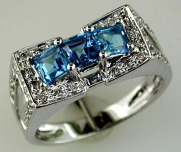 14KT WHITE GOLD MENSRING. 3D CLASSICDESIGN. ROUND DIAMONDS ARE F/G COLOR, VSSI CLARITY 0.22 CARATS. AAA PRINCESS BLUE TOPAZES ARE 1.25 CARATS. RING SIZE 10. CAN BE SIZED BY OUR MASTER JEWELER UPON REQUEST. WRITTEN APPRAISAL AVAILABLE. COMES IN A PRESENTABLE GIFT BOX.