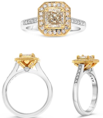 14KT WHITE AND YELLOW GOLD ENGAGEMENT RING. 3D SQUARE HALO OCTAGON CLASSIC DESIGN. WHITE ROUND DIAMONDS ARE F/G COLOR, VS CLARITY .32 CARATS. FANCY YELLOW CUSHION CUT DIAMOND IS 1.15 CARATS. RING SIZE 6.5. CAN BE SIZED BY OUR MASTER JEWELER UPON REQUEST. WRITTEN APPRAISAL AVAILABLE. COMES IN A PRESENTABLE GIFT BOX.