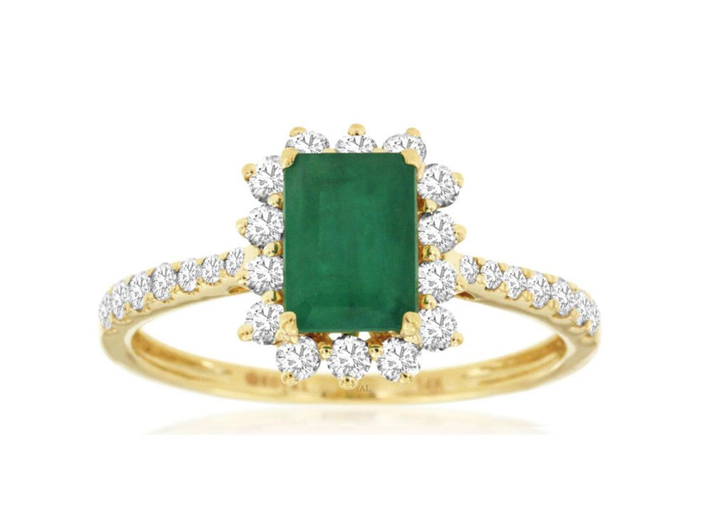 14KT YELLOW GOLD FRIENDSHIP RING. 3D CLASSIC HALO DESIGN. ROUND DIAMONDS ARE F/G COLOR, VSSI CLARITY .48 CARATS. AAA BAGUETTE EMERALD IS 1.0 CARAT. RING SIZE 7. CAN BE SIZED BY OUR MASTER JEWELER UPON REQUEST. WRITTEN APPRAISAL AVAILABLE. COMES IN A PRESENTABLE GIFT BOX.