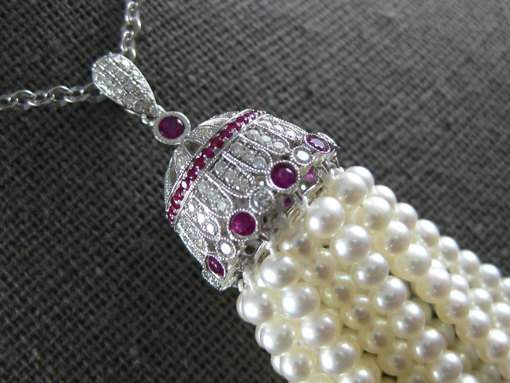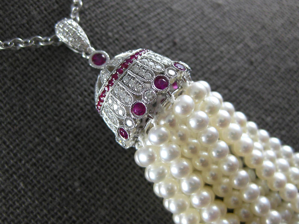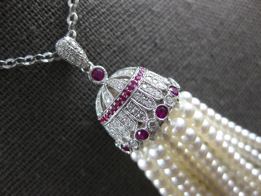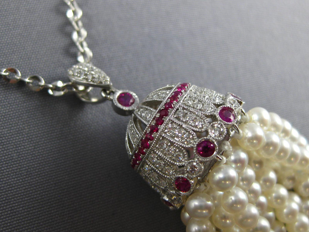 18KT WHITE GOLD NECKLACE. 3D FILIGREE CHANDELIER DESIGN. DIAMONDS ARE F/G COLOR, VS CLARITY .73 CARATS. AAA RUBIES ARE .75 CARATS. FEATURES AAA SOUTH SEA PEARLS. MEASURES 88.5mm WIDE. 34" INCHES LONG. WRITTEN APPRAISAL AVAILABLE. COMES IN A PRESENTABLE GIFT BOX.
