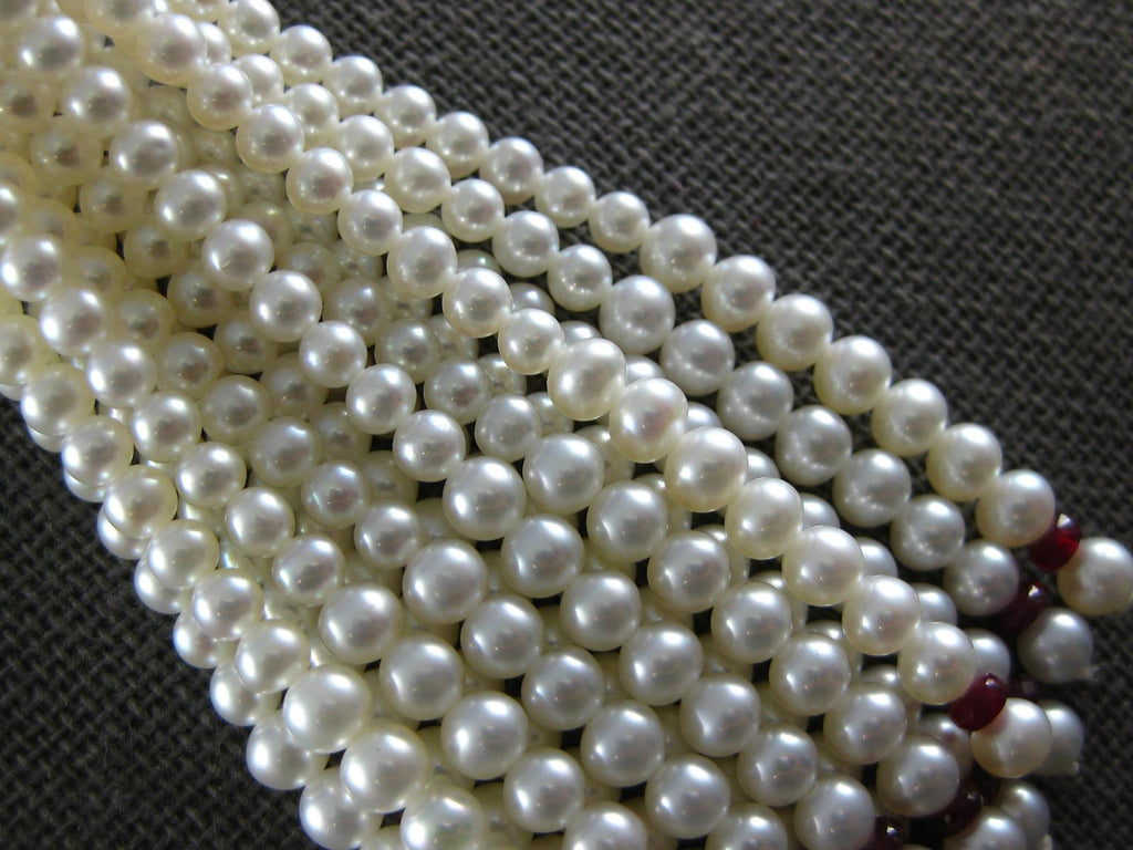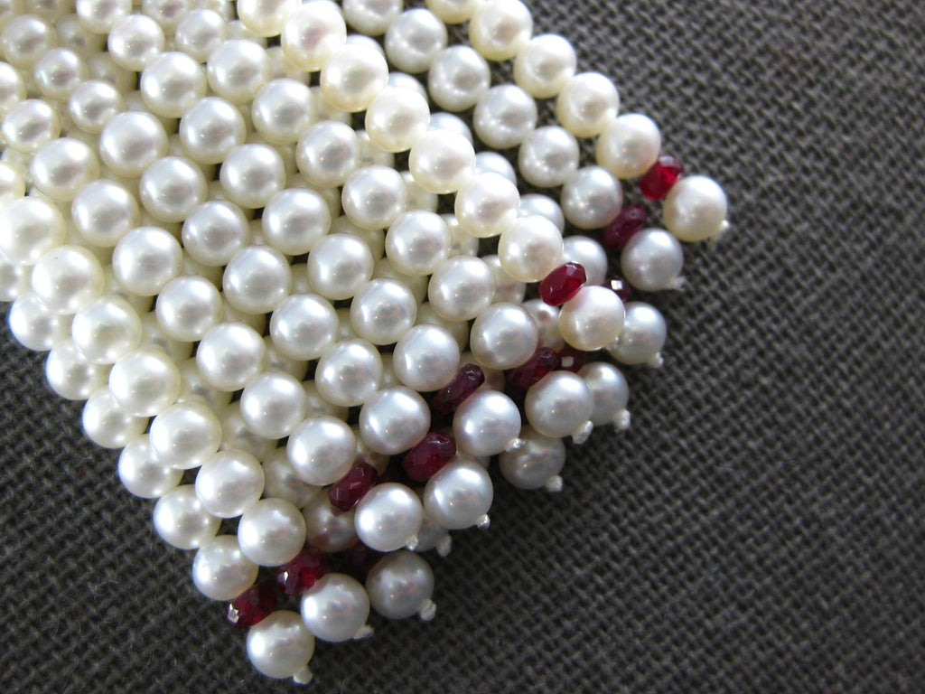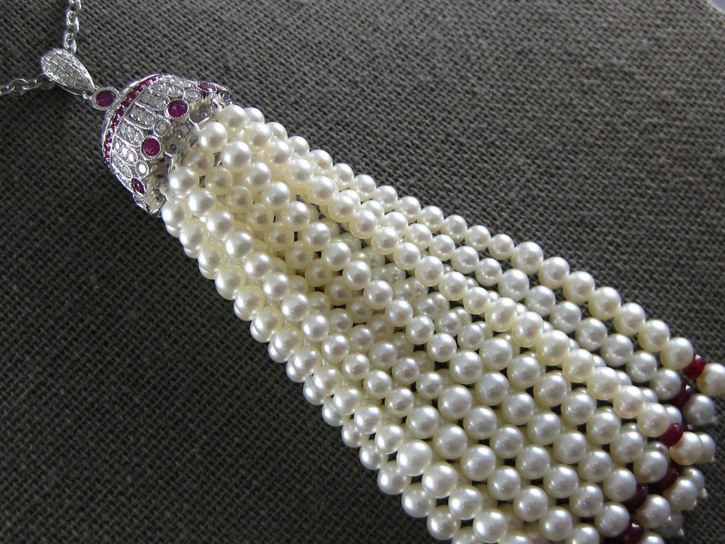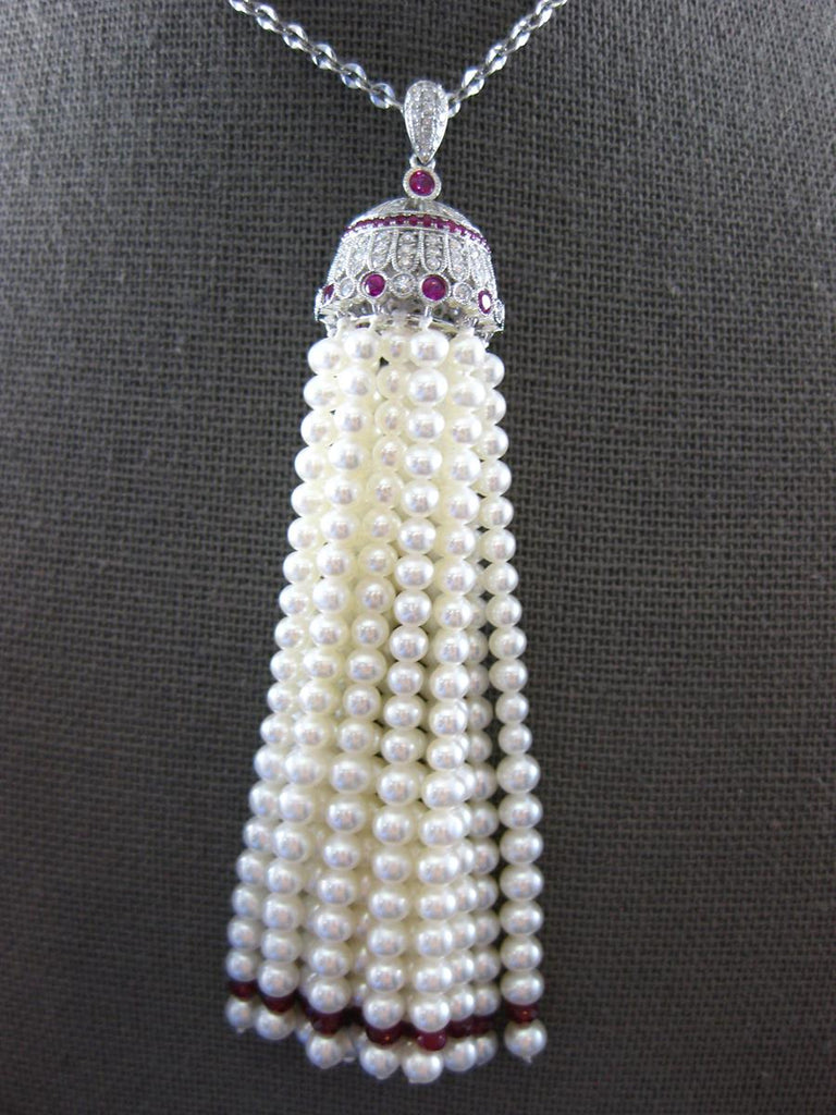 18KT WHITE GOLD NECKLACE. 3D FILIGREE CHANDELIER DESIGN. DIAMONDS ARE F/G COLOR, VS CLARITY .73 CARATS. AAA RUBIES ARE .75 CARATS. FEATURES AAA SOUTH SEA PEARLS. MEASURES 88.5mm WIDE. 34" INCHES LONG. WRITTEN APPRAISAL AVAILABLE. COMES IN A PRESENTABLE GIFT BOX.