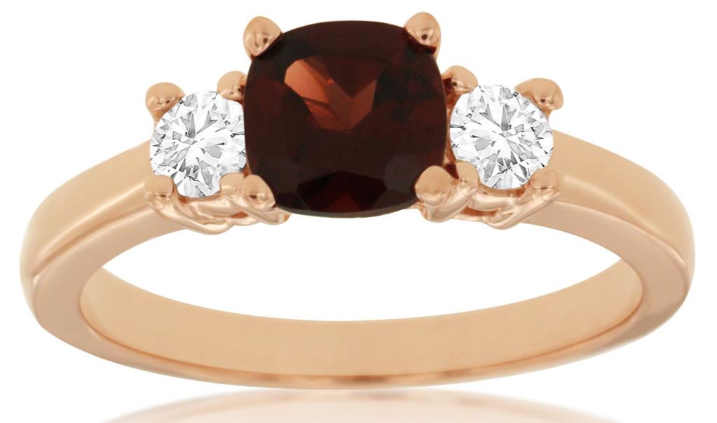 14KT ROSE GOLD FUN RING. 3D THREE STONE DESIGN. PRINCESS CUT DIAMONDS ARE F/G COLOR, VSSI CLARITY .30 CARATS. AAA EXTRA FACETED CUSHION CUT GARNET IS 1.20 CARATS. RING SIZE 7. CAN BE SIZED BY OUR MASTER JEWELER UPON REQUEST. WRITTEN APPRAISAL AVAILABLE. COMES IN A PRESENTABLE GIFT BOX.