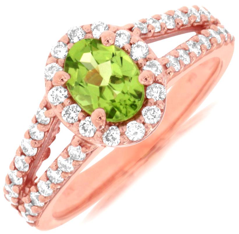 14KT ROSE GOLD FUN RING. 3D CLASSIC HALO DESIGN. ROUND DIAMONDS ARE F/G COLOR, VSSI CLARITY .65 CARATS. AAA OVAL PERIDOT IS .85 CARATS. RING SIZE 7. CAN BE SIZED BY OUR MASTER JEWELER UPON REQUEST. WRITTEN APPRAISAL AVAILABLE. COMES IN A PRESENTABLE GIFT BOX.