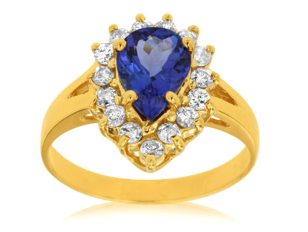 14KT YELLOW GOLD RING. 3D CLASSIC DESIGN. ROUND DIAMONDS ARE F/G COLOR, VSSI CLARITY .40 CARATS. AAA PEAR SHAPE TANZANITE IS 1.10 CARATS. RING SIZE 7. CAN BE SIZED BY OUR MASTER JEWELER UPON REQUEST. WRITTEN APPRAISAL AVAILABLE. COMES IN A PRESENTABLE GIFT BOX.