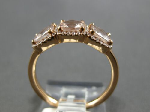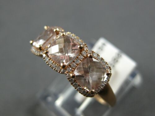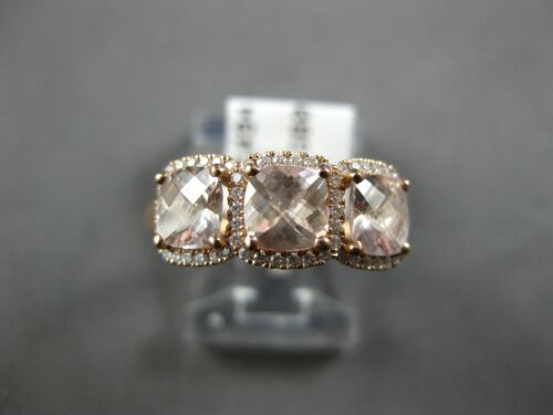 14KT ROSE GOLD RING. 3D HALO THREE STONE PAST PRESENT FUTURE DESIGN. ROUND DIAMONDS ARE F/G COLOR, VSSI CLARITY .16 CARATS. AAA EXTRA FACETED CUSHION CUT MORGANITES ARE 1.35 CARATS. MEASURES 7mm WIDE. RING SIZE 6.5. CAN BE SIZED BY OUR MASTER JEWELER UPON REQUEST. WRITTEN APPRAISAL AVAILABLE. COMES IN A PRESENTABLE GIFT BOX.
