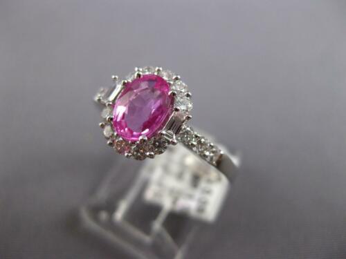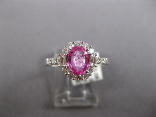 18KT WHITE GOLD ENGAGEMENT RING. 3D CLASSIC FLOWER DESIGN. DIAMONDS ARE F/G COLOR, VSSI CLARITY. ROUND DIAMONDS ARE .42 CARATS. BAGUETTE DIAMONDS ARE .09 CARATS. AAA OVAL PINK SAPPHIRE IS 1.03 CARATS. PINK SAPPHIRE MEASURES 7.5mm WIDE. RING MEASURES 10mm WIDE. RING SIZE 7. CAN BE SIZED BY OUR MASTER JEWELER UPON REQUEST. WRITTEN APPRAISAL AVAILABLE. COMES IN A PRESENTABLE GIFT BOX.