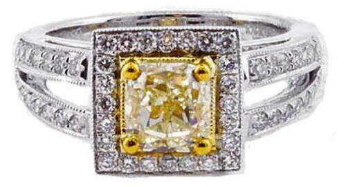 18KT WHITE AND YELLOW GOLD ENGAGEMENT RING. 3D SQUARE HALO FILIGREE MILGRAIN DESIGN. ROUND WHITE DIAMONDS ARE F/G COLOR, VSSI CLARITY .49 CARATS. CUSHION CUT FANCY YELLOW DIAMOND IS .49 CARATS. RING SIZE 7. CAN BE SIZED BY OUR MASTER JEWELER UPON REQUEST. WRITTEN APPRAISAL AVAILABLE. COMES IN A PRESENTABLE GIFT BOX.