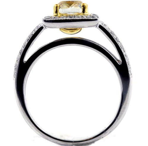 1.54CT WHITE & FANCY YELLOW DIAMOND 18K 2 TONE GOLD CUSHION HALO ENGAGEMENT RING
