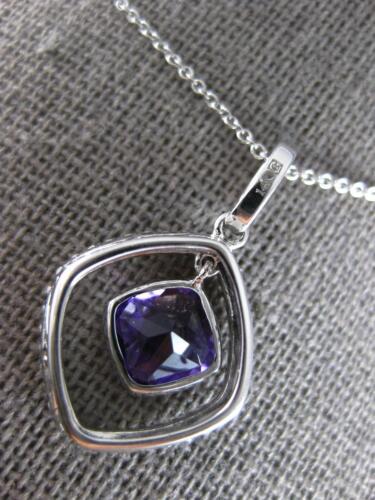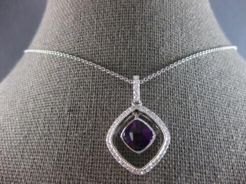 14KT WHITE GOLD FLOATING PENDANT. 3D SQUARE GEOMETRICAL TEAR DROP DESIGN. ROUND DIAMONDS ARE F/G COLOR, VSSI CLARITY CARATS. AAA EXTRA FACETED CUSHION CUT AMETHYST IS 1.27 CARATS. MEASURES 25.2mm X 15mm. COMES ON A 14KT GOLD DIAMOND CUT 16" INCH CHAIN. WRITTEN APPRAISAL AVAILABLE. COMES IN A PRESENTABLE GIFT BOX.