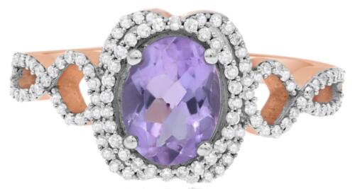 14KT WHITE AND ROSE GOLD LOVE RING. 3D FLOWER DOUBLE INFINITY DESIGN. ROUND DIAMONDS ARE F/G COLOR, VSSI CLARITY .35 CARATS. AAA EXTRA FACETED OVAL AMETHYST IS 1.20 CARATS. RING SIZE 7. CAN BE SIZED BY OUR MASTER JEWELER UPON REQUEST.