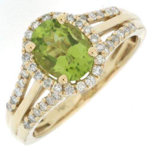 14KT YELLOW GOLD FRIENDSHIP RING. 3D HALO DESIGN. ROUND DIAMONDS ARE F/G COLOR, VSSI CLARITY .30 CARATS. AAA EXTRA FACETED OVAL PERIDOT IS 1.25 CARATS. RING SIZE 7. CAN BE SIZED BY OUR MASTER JEWELER UPON REQUEST. WRITTEN APPRAISAL AVAILABLE. COMES IN A PRESENTABLE GIFT BOX.