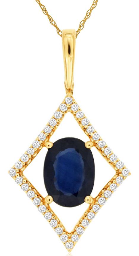 14KT YELLOW GOLD LOVE PENDANT. 3D GEOMETRIC DESIGN. ROUND DIAMONDS ARE F/G COLOR, VSSI CLARITY 0.15 CARATS. AAA OVAL SAPPHIRE IS 1.40 CARATS.COMES ON A 14KT GOLD DIAMOND CUT 16" INCH CHAIN.WRITTEN APPRAISAL AVAILABLE. COMES IN A PRESENTABLE GIFT BOX.
